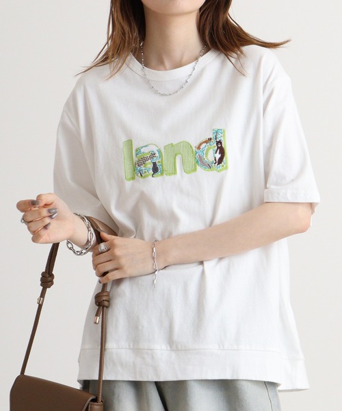 陸のチーター、ネコ、クマ×「Land」ロゴ刺繍Tシャツです。夏らしいヤシの木と涼し気なストライプ柄のロゴになりました。