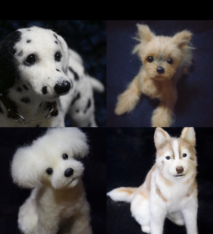 羊毛フェルトは文字通り羊の毛を特殊な針で突いて固めながら作っています。土台の芯にはワイヤーを使い周りを土台用の羊毛で固めてベースを作っています。その土台の上に丁寧に食物という技術を使い毛並みを整えて本物に近いワンちゃんたちを作り上げています…犬種、髪型によって色々な羊毛を使い分けています。
