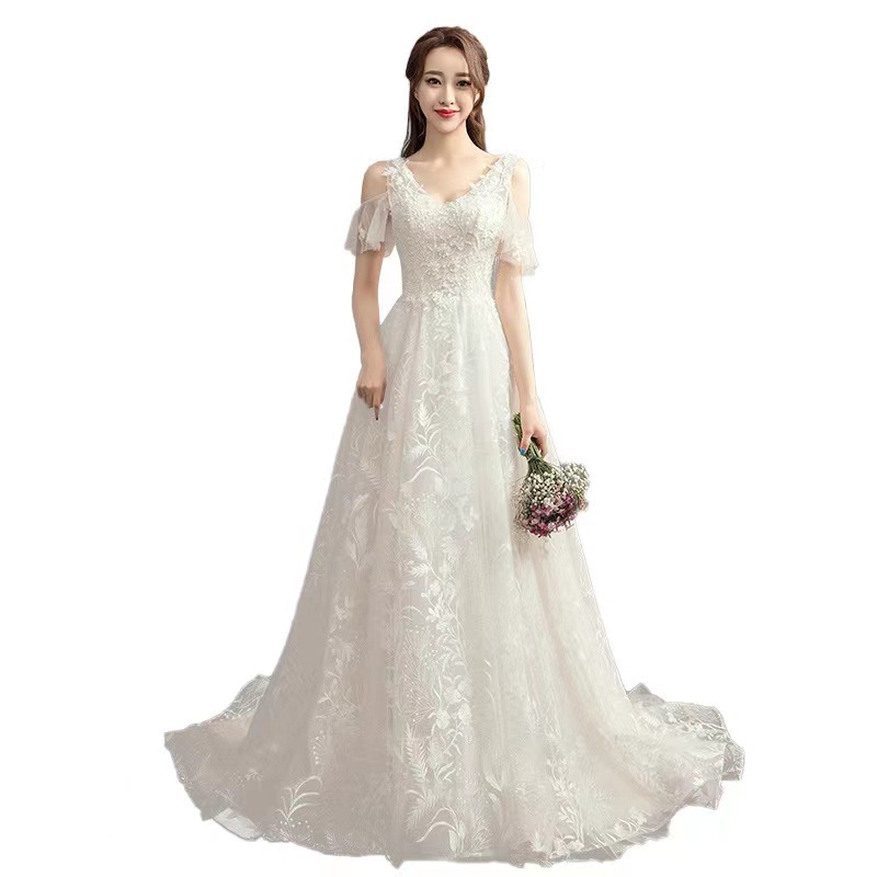 注文割引ウェディングドレス ウェディングドレス白 パーティードレス エンパイア/トレーン 花嫁ロングドレス 結婚式 V襟 二次会 エレガント レース 挙式hs4995