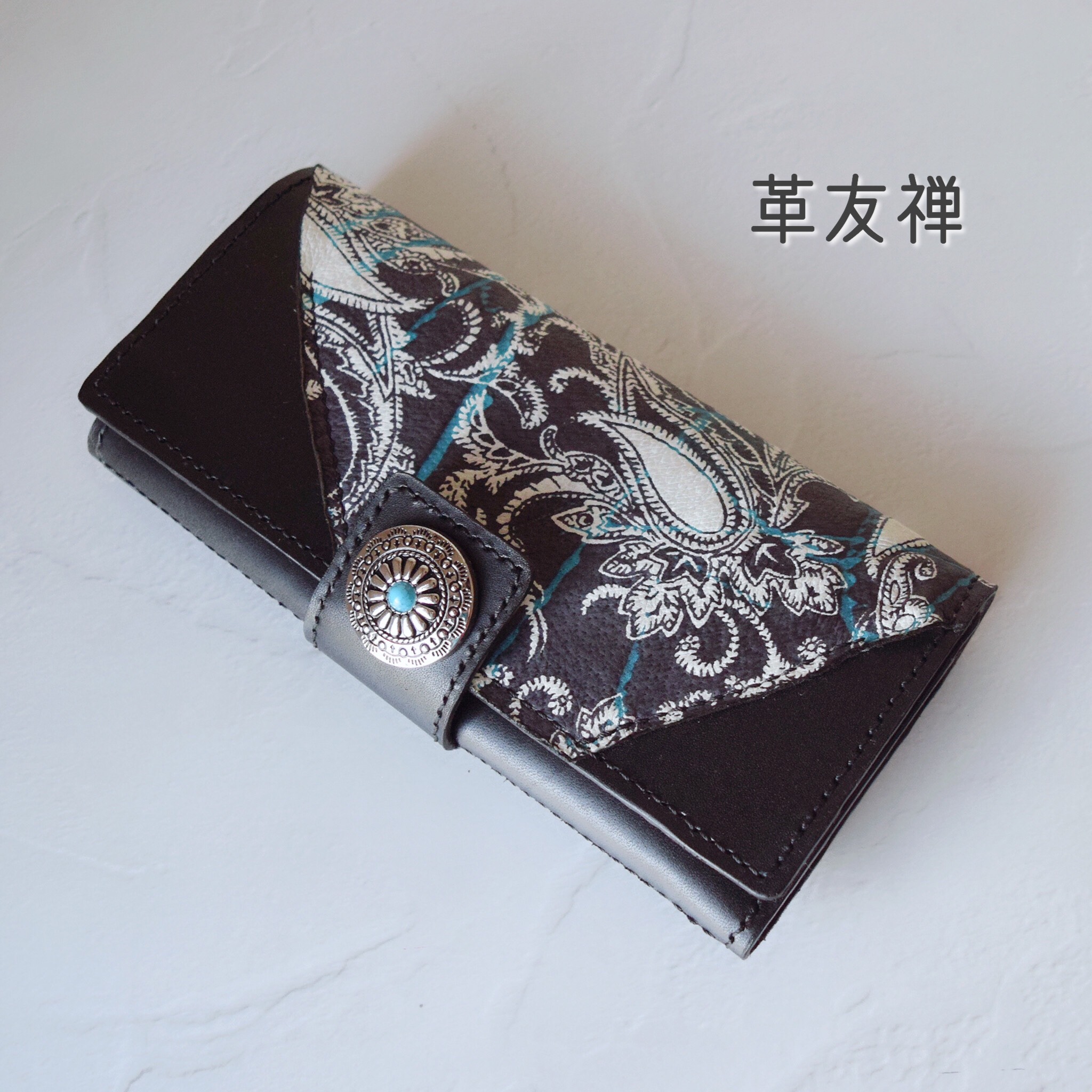 革友禅のペイズリー柄の端革を使い、本革ブラックとコンチョボタンを合わせたデザインで長財布を作りました。