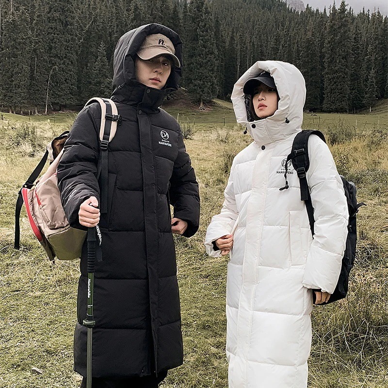 男女カップル向けドラマダウンジャケットのハイバージョン膝丈ロング学生服冬用フード付き厚手ジャケット